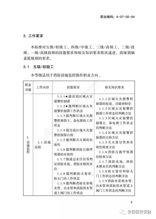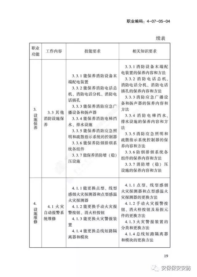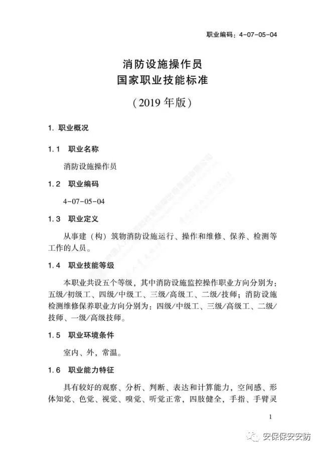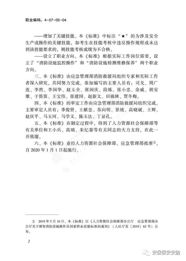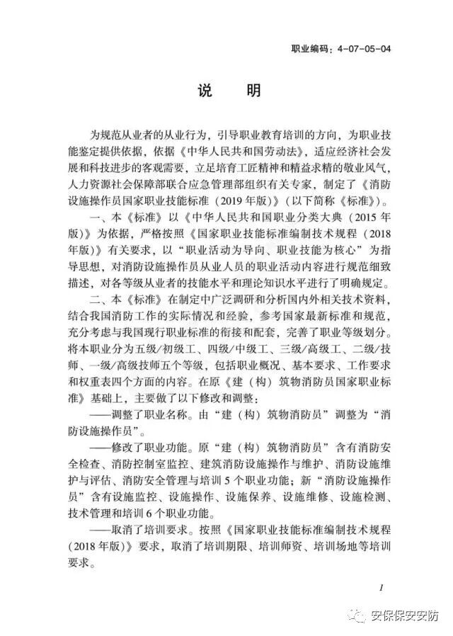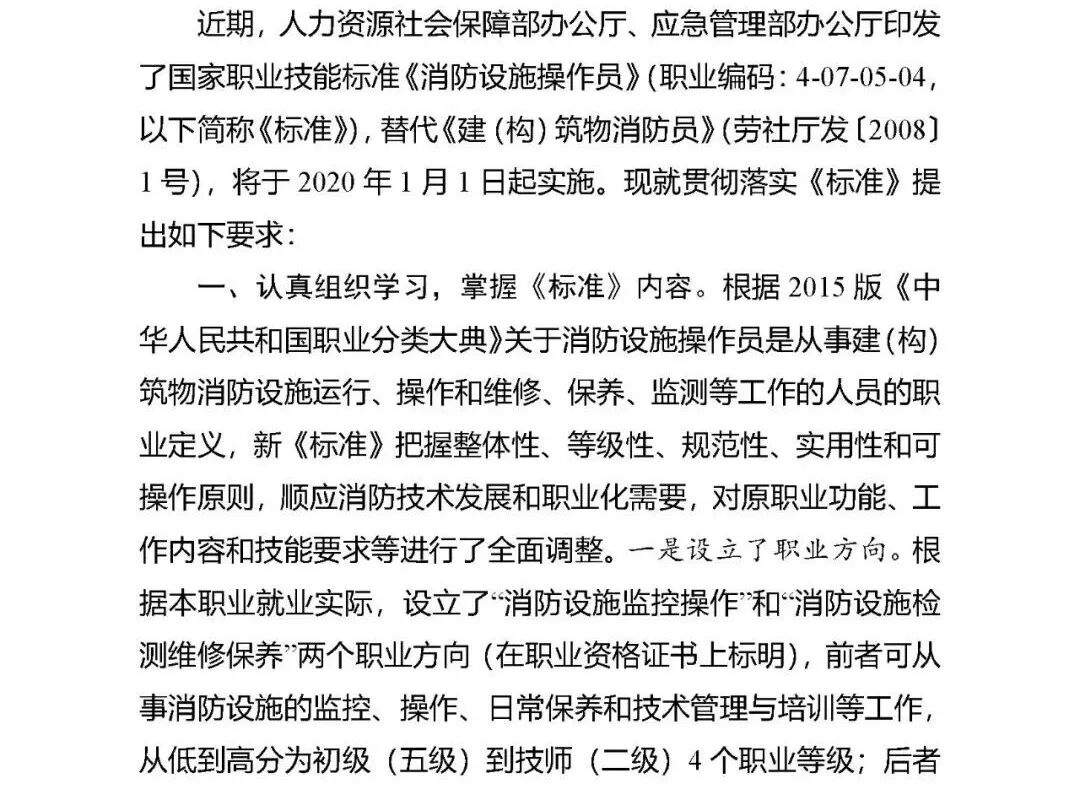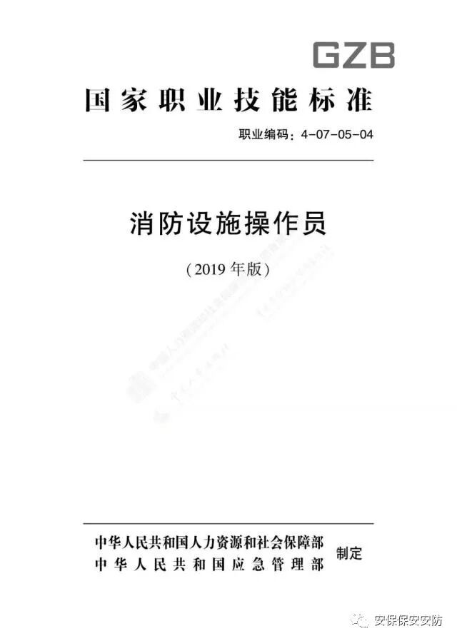 国家职业技能标准《消防设施操作员》2020年1月1日起实施