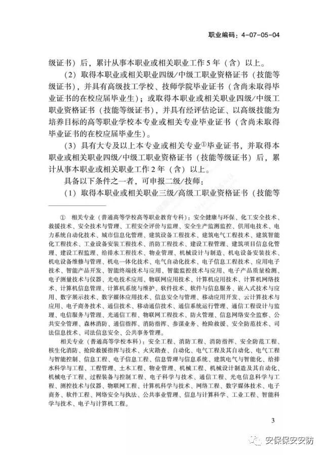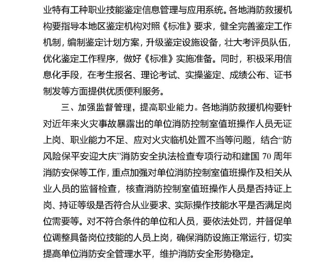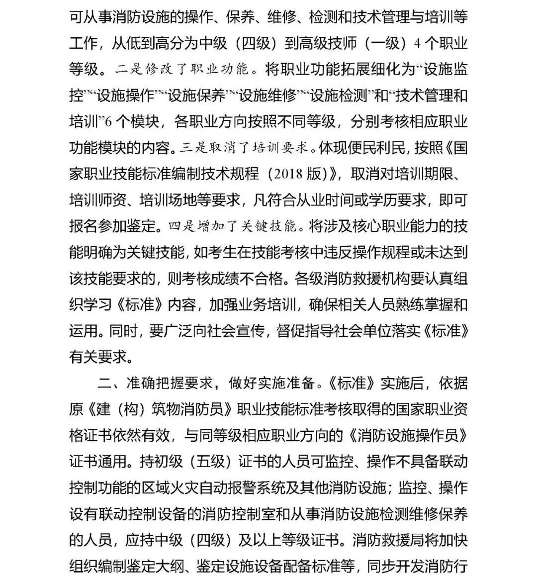 1.证书分级将做调整 “根据本职业就业实际,设立“消防设施监控操作”和“消防设施检测维修保养”两个职业方向(在职业资格证书上标明),前者可从事消防设施的监控、操作、日常保养和技术管理与培训等工作,从低到高分为初级(五级)到技师(二级)4个职业等级;后者可从事消防设施的操作、保养、维修、检测和技术管理与培训等工作,从低到高分为中级(四级)到高级技师(一级)4个职业等级。” 如果从事监控与检测,就要考取两个证书! 2.考试难度加大 “将职业功能拓展细化为“设施监控”“设施操作”“设施保养”“设施维修”“设施检测”和“技术管理和培训”6个模块,各职业方向按照不同等级,分别考核相应职业功能模块的内容。” “将涉及核心职业能力的技能明确为关键技能,如考生在技能考核中违反操作规程或未达到该技能要求的,则考核成绩不合格。” 持初级(五级)证书的人员可监控、操作不具备联动控制功能的区域火灾自动报警系统及其他消防设施;监控、操作设有联动控制设备的消防控制室和从事消防设施检测维修保养的人员,应持中级(四级)及以上等级证书。现在的消防设备基本都是联动的。 3.原取得证书依然通用 “《标准》实施后,依据原《建(构)筑物消防员》职业技能标准考核取得的国家职业资格证书依然有效,与同等级相应职业方向的《消防设施操作员》证书通用。” 4.监督检查力度将加大 “各地消防救援机构要针对近年来火灾事故暴露出的单位消防控制室值班操作人员无证上岗、职业能力不足、应对火灾临机处置不当等问题,结合“防风险保平安迎大庆”消防安全执法检查专项行动和建国70周年消防安保等工作,重点加强对单位消防控制室值班操作及相关从业人员的监督检查,核查消防控制室值班操作人员是否持证上岗、持证等级是否符合从业要求、实际操作技能水平是否满足岗位需要等。”