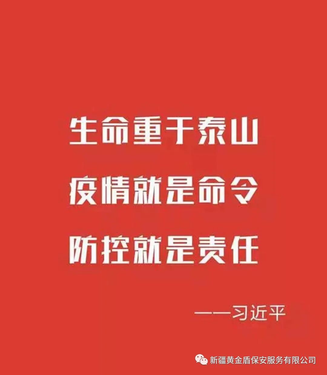 他们顾不上与家人开心团圆 同心协力共战“疫” 带着亲人的牵挂 24小时执勤在防控卡点 筑牢社区、办公楼疫情防控严密防线 将初心化成行动 用脚步丈量土地 打赢防疫战,保安在行动 他们日夜驻守在每个辖区出入口 排查车辆疑似隐患 全天候保障“四门落锁” 构筑阻断病毒的钢铁长城 在这样寒冷的天气里 有一群人无法享受家的温暖 他们用责任和使命奋战在疫情第一线 在寒风中守卫着我们的家园 他们是真正的战地志华 默默扎根在基层 盛开在凛凛寒冬 风越吹,雪越摧,茎越韧,叶越壮! 牢 记 使 命 “疫” 往 无 前 他们感同身受传递爱心 一己绵薄之力点亮疫区群众希望之灯 当命令来临的时候 他们总是毫无怨言冲在前面 确保社会治安有序井然 不忘初心 书写忠诚 他们没有铮铮誓言 一个口罩就是他们的防护 没有惊天动地的伟业 他们只有一张群众熟悉的面孔 这就是我们疫情防控的一线工作 感谢他们的默默付出和贴心守护 请为他们点赞 慰问信 奋战在一线的黄金盾家人: 一场突如其来的疫情打乱了春节的脚步,一场重大疫情狙击战拉开序幕!在中央、区、州、市集中统一领导下,一场保卫家园、守望生命的战争不断升级!黄金盾保安积极响应党中央号召,坚决落实阜康市防疫指挥部各项决策,紧急行动,全力支持,迅速启动战时工作机制。主要领导坚守岗位、以上率下,带班干部在岗在位、以身作则,安排值班保安员24小时值班值守,全体保安员带头战斗在疫情防控第一线。 非常之时必有非常之人,非常之事见证非常之情。这几天去看微信朋友圈步数排行,每天排名靠前的不是医护工作者就一定是你们——保安员。疫情防控期间,公司所有保安员配合防疫等部门组织开展相关人员排查,为甲方疫情防控工作作出了积极贡献,驻勤单位未发生重大治安案件、群体性事件和疫情蔓延情况。 在这场未打完的新型冠状病毒肺炎疫情狙击战中,保安人员放弃春节假日休息时间,以高度的政治责任感和使命感舍小家、为大家,挺身而出、逆向冲锋,完美诠释了中国人“甘于奉献、大爱无疆”的崇高精神。 公司董事长魏永超在此向奋战在一线的保安队员致以亲切的慰问:“您们辛苦了,在做好防御的同时请一定要保护好自己,您的安全是公司最大的牵挂”! 董事长:魏永超 2020年2月28日 中 国 加 油 武 汉